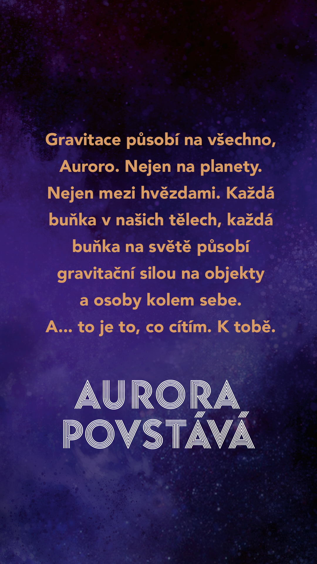 Gravitace působí na všechno, Auroro. Nejen na planety. Nejen mezi hvězdami. Každá buňka v našich tělech, každá buňka na světě působí gravitační silou na objekty a osoby kolem sebe. A… to je to, co cítím. K tobě.