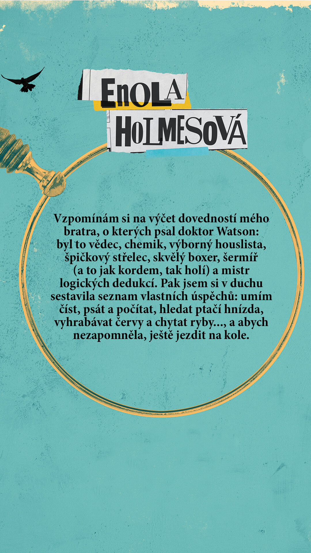 Vzpomínám si na výčet dovedností mého bratra, o kterých psal doktor Watson: byl to vědec, chemik, výborný houslista, špičkový střelec, skvělý boxer, šermíř (a to jak kordem, tak holí) a mistr logických dedukcí. Pak jsem si v duchu sestavila seznam vlastních úspěchů: umím číst, psát a počítat, hledat ptačí hnízda, vyhrabávat červy a chytat ryby…, a abych nezapomněla, ještě jezdit na kole.