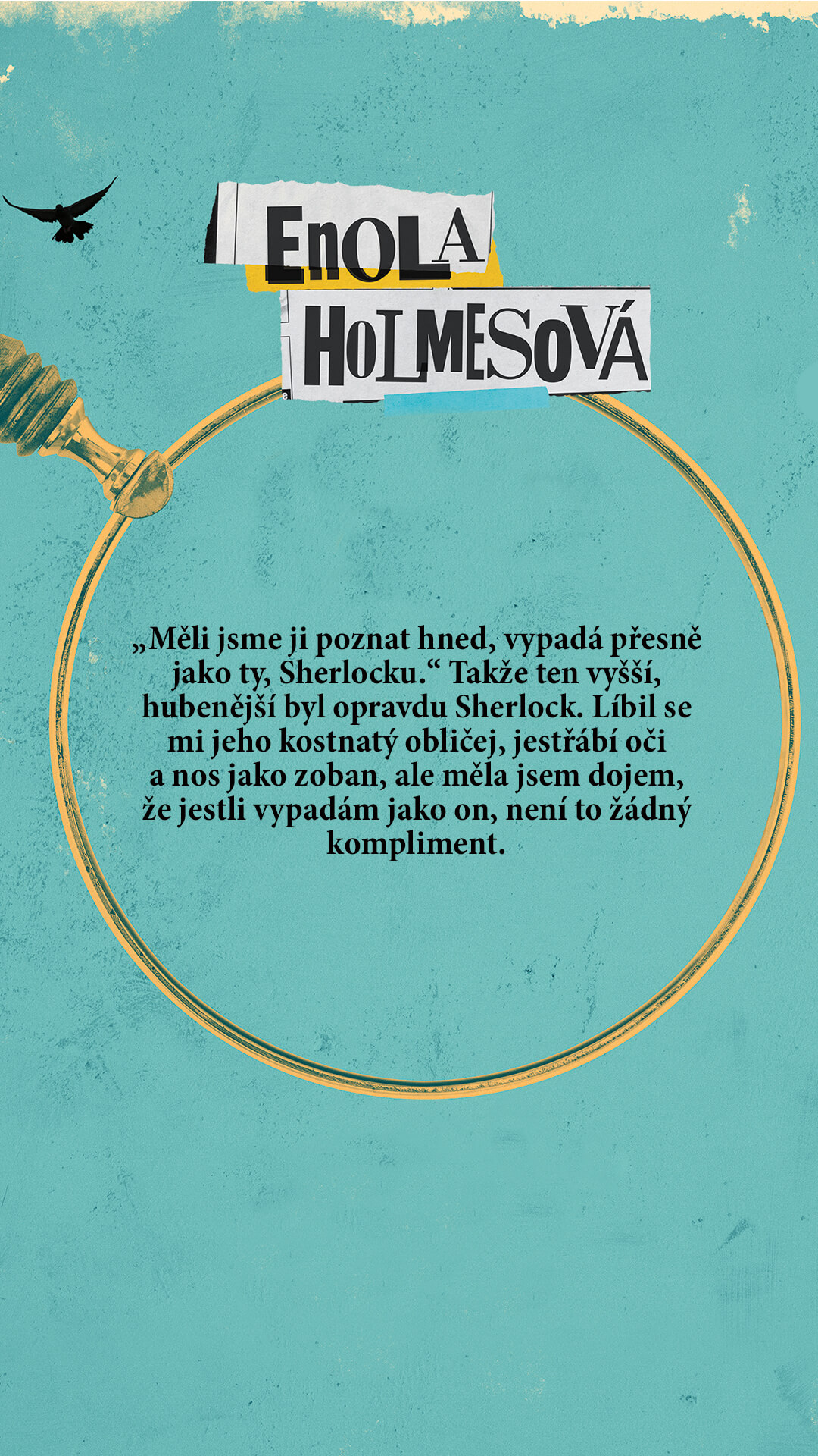 „Měli jsme ji poznat hned, vypadá přesně jako ty, Sherlocku.“ Takže ten vyšší, hubenější byl opravdu Sherlock. Líbil se mi jeho kostnatý obličej, jestřábí oči a nos jako zoban, ale měla jsem dojem, že jestli vypadám jako on, není to žádný kompliment.