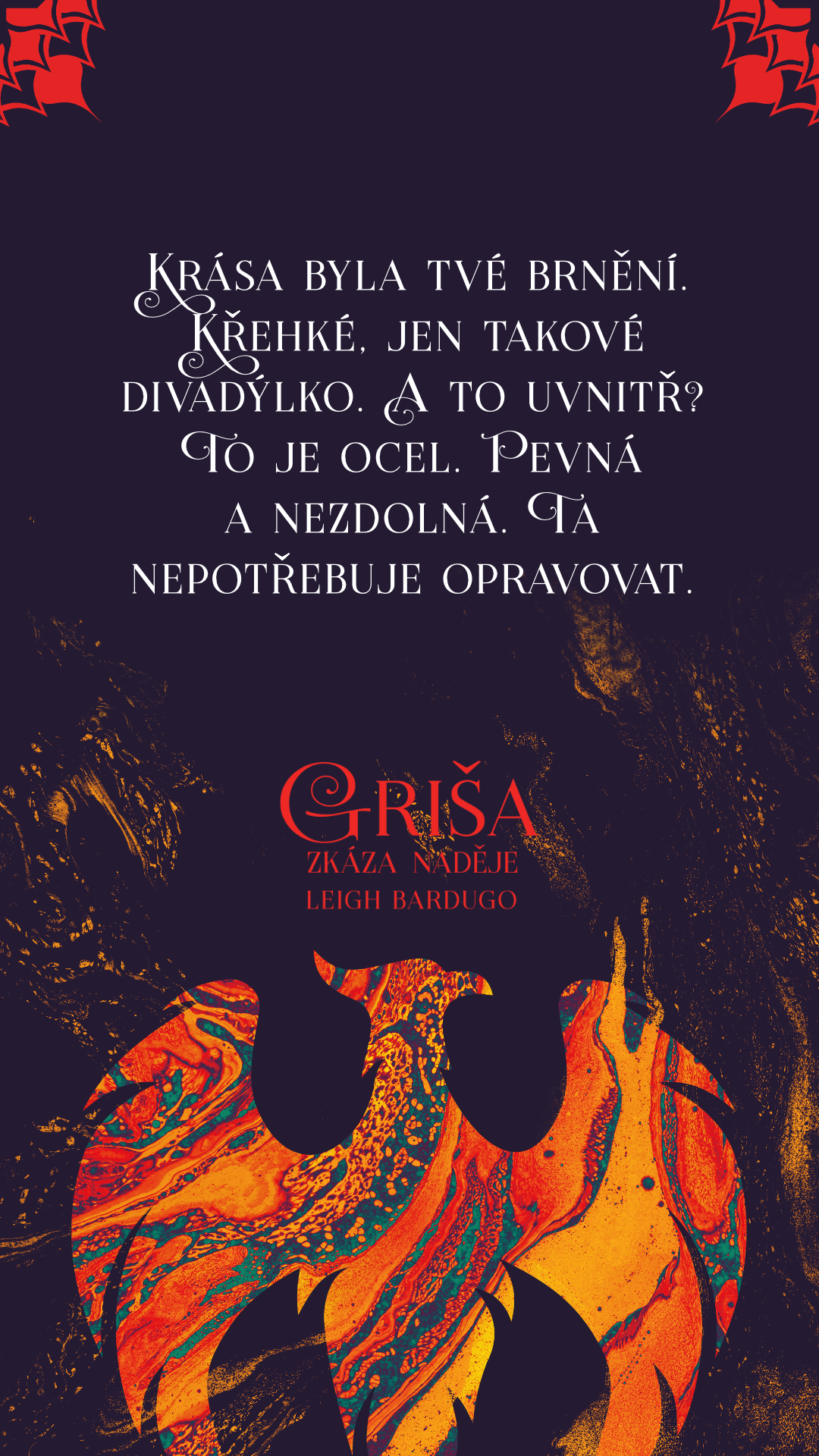 Krása byla tvé brnění. Křehké, jen takové divadýlko. A to uvnitř? To je ocel. Pevná a nezdolná. Ta nepotřebuje opravovat.