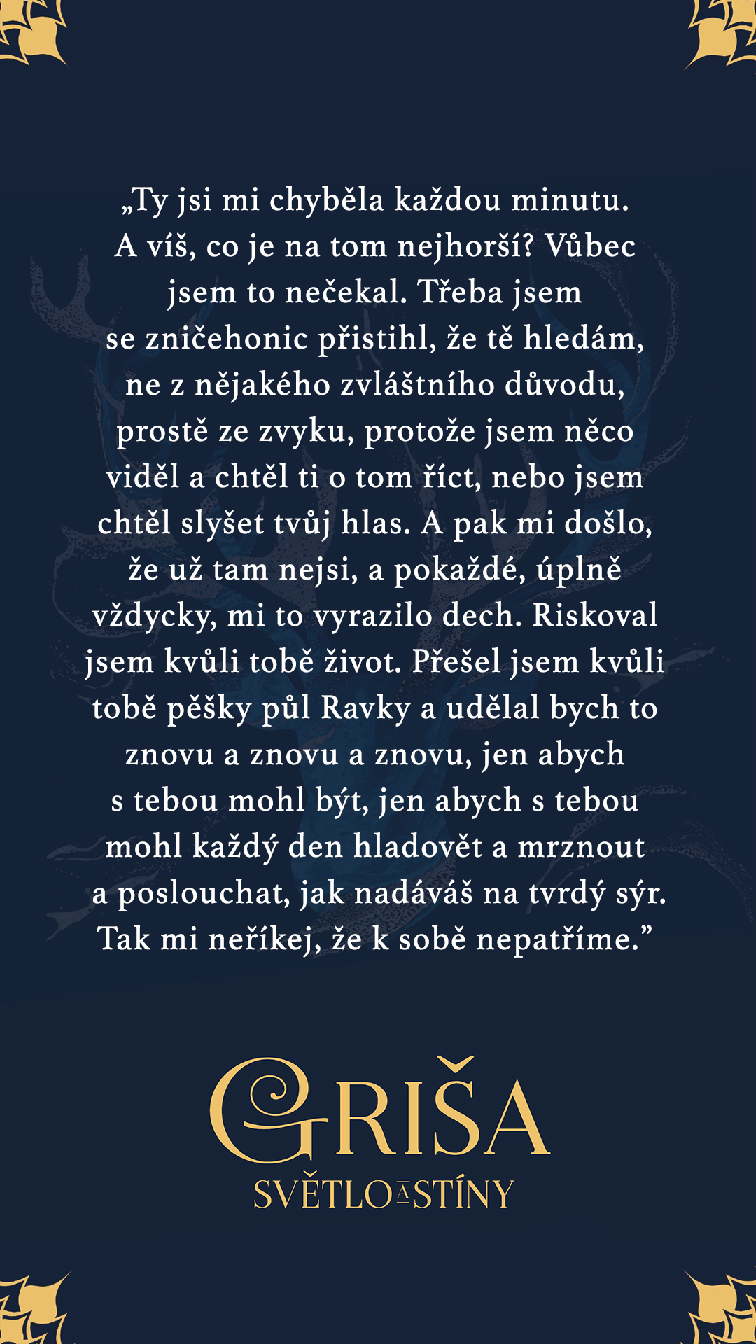 Ty jsi mi chyběla každou minutu. A víš, co je na tom nejhorší? Vůbec jsem to nečekal. Třeba jsem se zničehonic přistihl, že tě hledám, ne z nějakého zvláštního důvodu, prostě ze zvyku, protože jsem něco viděl a chtěl ti o tom říct, nebo jsem chtěl slyšet tvůj hlas. A pak mi došlo, že už tam nejsi, a pokaždé, úplně vždycky, mi to vyrazilo dech. Riskoval jsem kvůli tobě život. Přešel jsem kvůli tobě pěšky půl Ravky a udělal bych to znovu a znovu a znovu, jen abych s tebou mohl být, jen abych s tebou mohl každý den hladovět a mrznout a poslouchat, jak nadáváš na tvrdý sýr. Tak mi neříkej, že k sobě nepatříme.