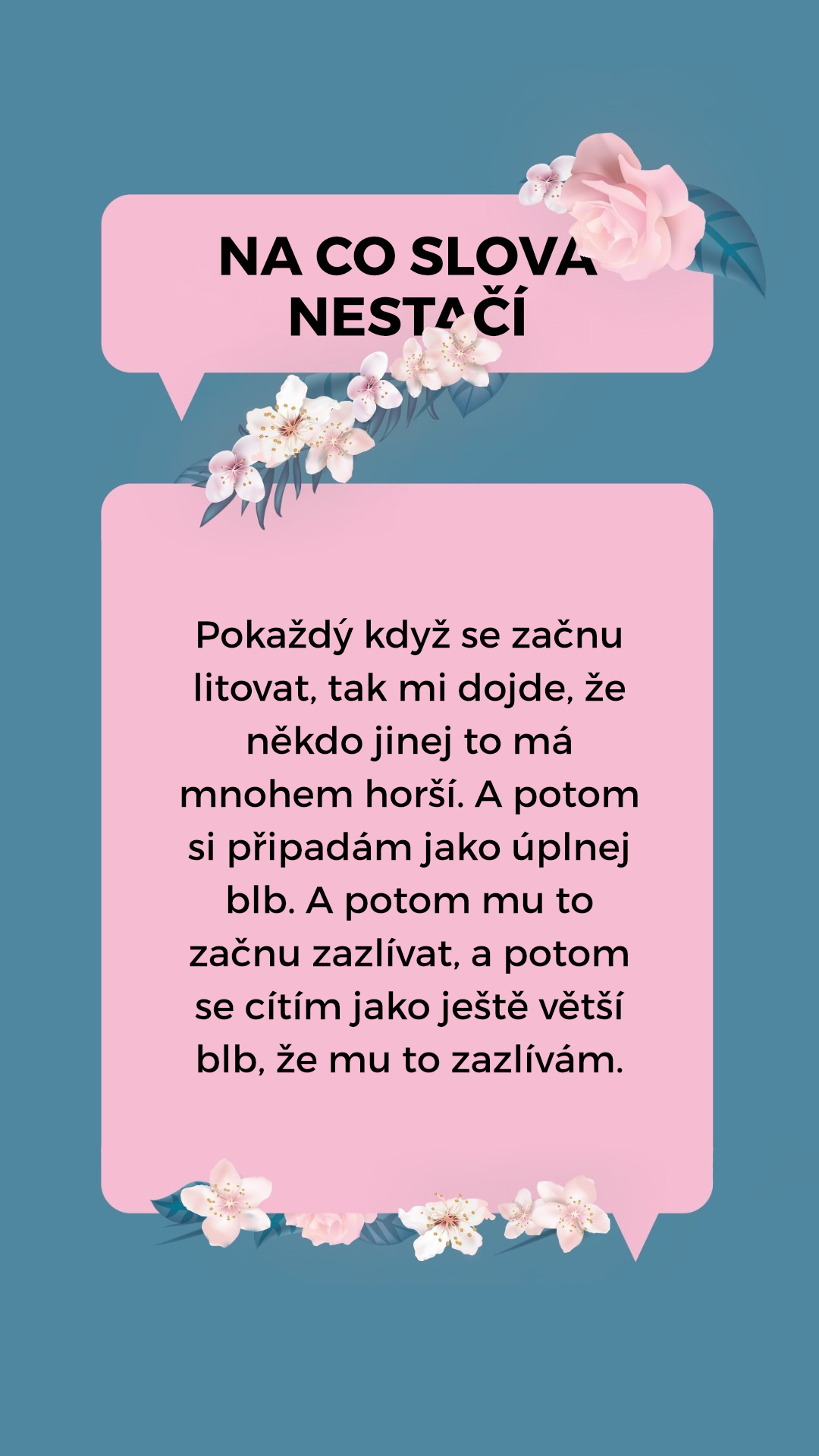 Pokaždý když se začnu litovat, tak mi dojde, že někdo jinej to má mnohem horší. A potom si připadám jako úplnej blb. A potom mu to začnu zazlívat, a potom se cítím jako ještě větší blb, že mu to zazlívám.