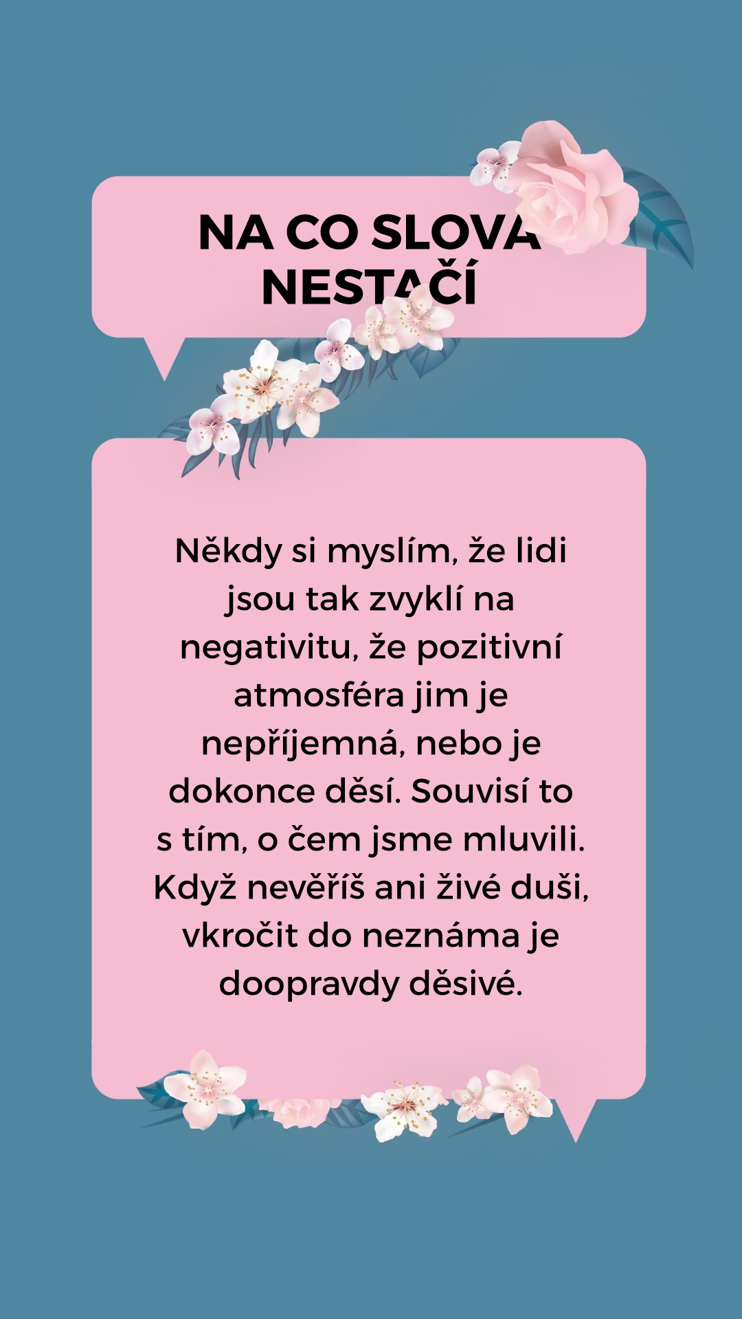 Někdy si myslím, že lidi jsou tak zvyklí na negativitu, že pozitivní atmosféra jim je nepříjemná, nebo je dokonce děsí. Souvisí to s tím, o čem jsme mluvili. Když nevěříš ani živé duši, vkročit do neznáma je doopravdy děsivé.