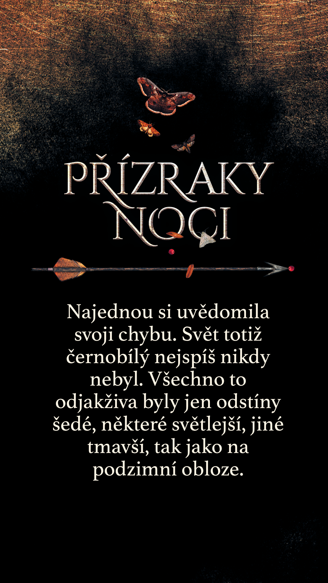 Najednou si uvědomila svoji chybu. Svět totiž černobílý nejspíš nikdy nebyl. Všechno to odjakživa byly jen odstíny šedé, některé světlejší, jiné tmavší, tak jako na podzimní obloze.