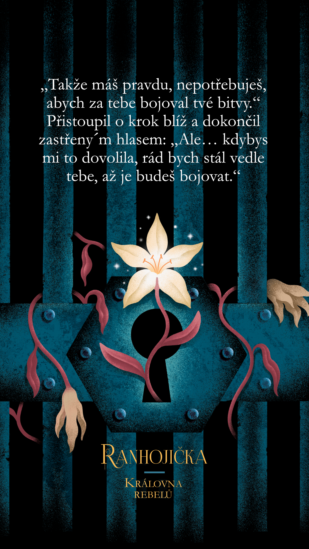 „Takže máš pravdu, nepotřebuješ, abych za tebe bojoval tvé bitvy.“ Přistoupil o krok blíž a dokončil zastřeným hlasem: „Ale… kdybys mi to dovolila, rád bych stál vedle tebe, až je budeš bojovat.“