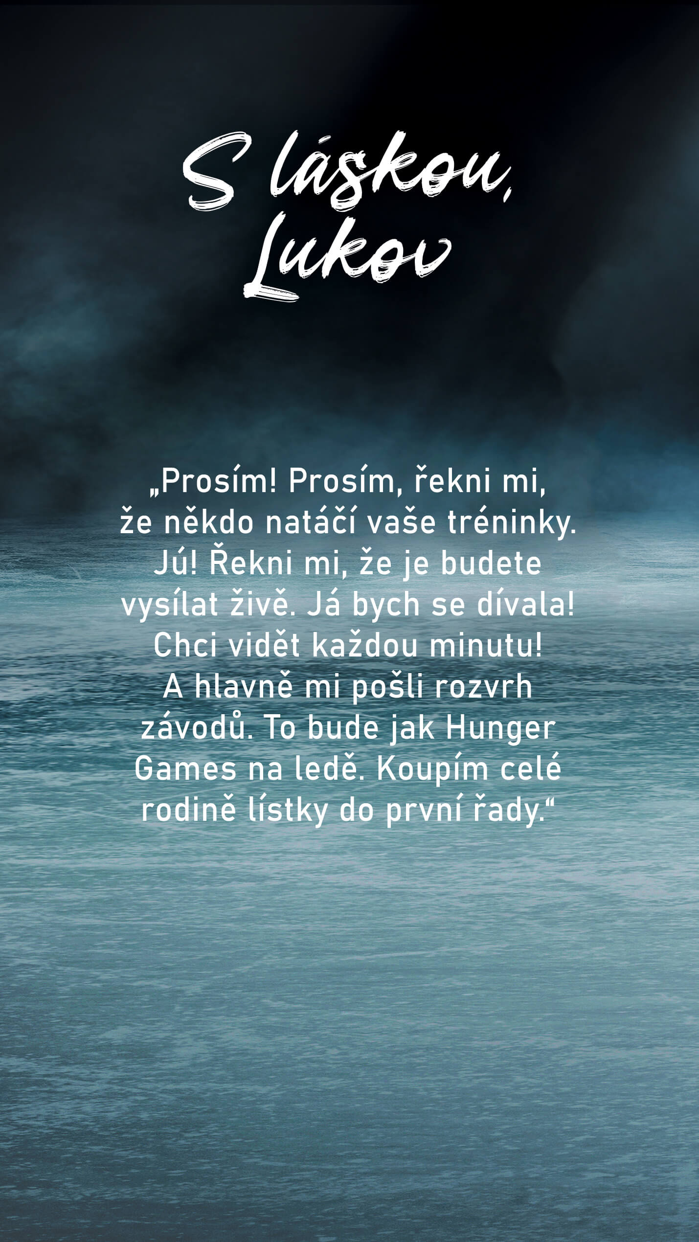 Prosím! Prosím, řekni mi, že někdo natáčí vaše tréninky. Jú! Řekni mi, že je budete vysílat živě. Já bych se dívala! Chci vidět každou minutu! A hlavně mi pošli rozvrh závodů. To bude jak Hunger Games na ledě. Koupím celé rodině lístky do první řady.