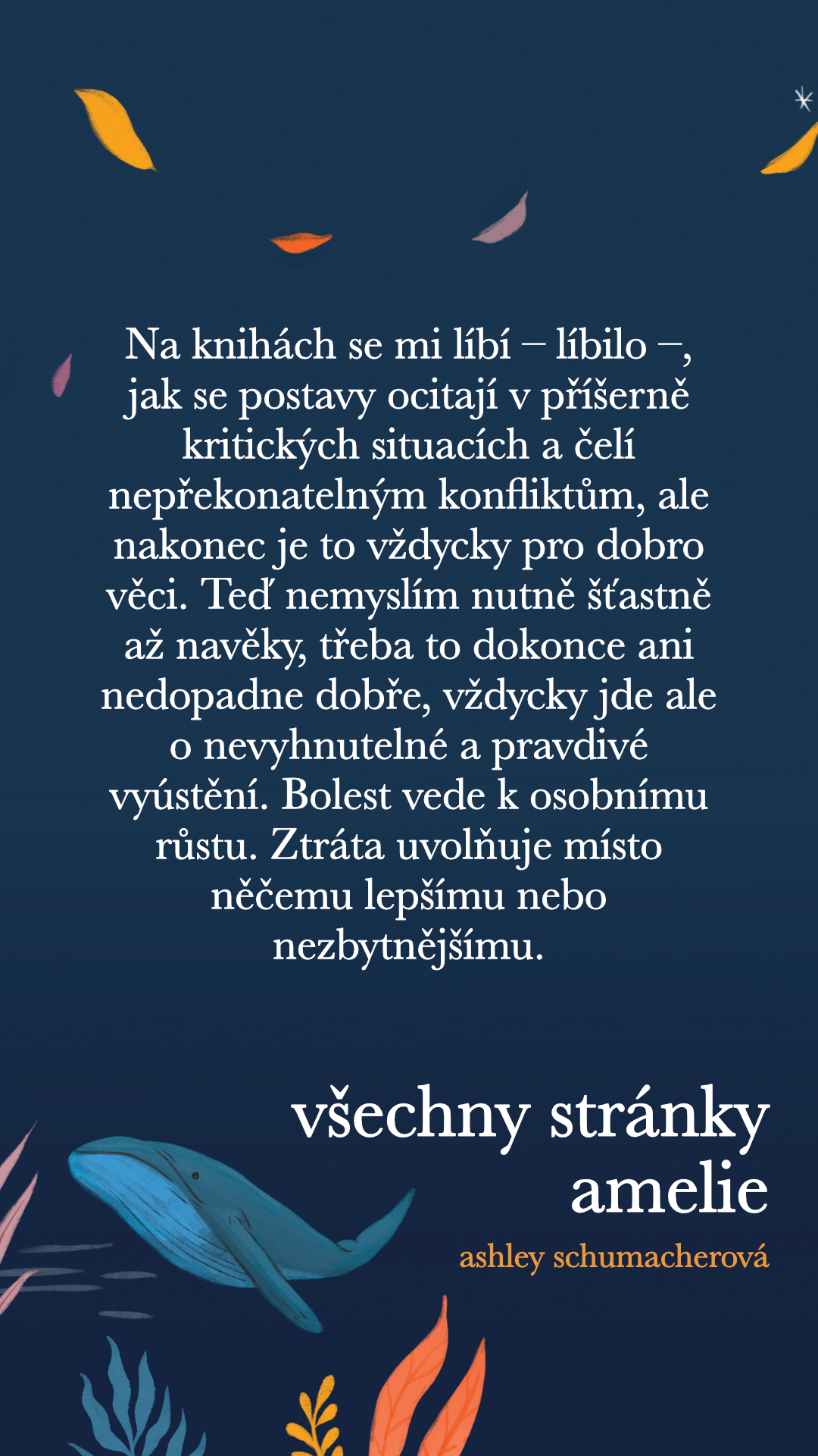 Na knihách se mi líbí – líbilo –, jak se postavy ocitají v příšerně kritických situacích a čelí nepřekonatelným konfliktům, ale nakonec je to vždycky pro dobro věci. Teď nemyslím nutně šťastně až navěky, třeba to dokonce ani nedopadne dobře, vždycky jde ale o nevyhnutelné a pravdivé vyústění. Bolest vede k osobnímu růstu. Ztráta uvolňuje místo něčemu lepšímu nebo nezbytnějšímu.
