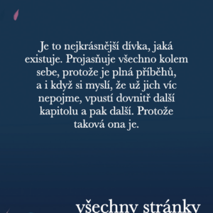 Je to nejkrásnější dívka, jaká existuje. Projasňuje všechno kolem sebe, protože je plná příběhů, a i když si myslí, že už jich víc nepojme, vpustí dovnitř další kapitolu a pak další. Protože taková ona je.