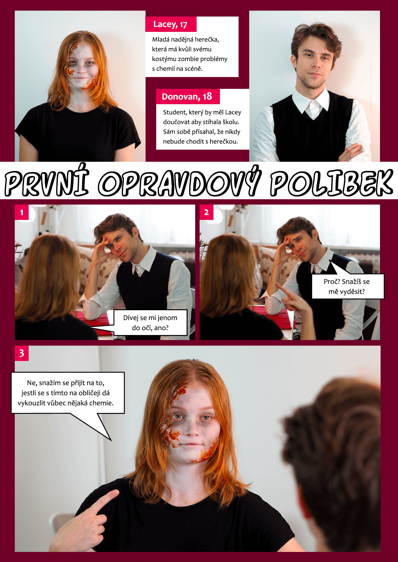 Pamatujete si ještě fotoromány, nebo je to už velké retro? 😁 My jsme je zbožňovali a hlavně vždycky chtěli nějaký vytvořit. Tak jsme si jednou na poradě HumbookTeamu řekli, že do toho půjdeme, vyzkoušíme a uvidíme, co z toho vznikne. (A hodně nás to naučilo – třeba nejlepší fake krev uděláte z kečupu, nutelly a barbecue omáčky 🤢) Nevymýšleli jsme vlastní příběh a převzali jednu scénu z nové knížky Kasie West – První opravdový polibek. Na zkoušku tu máme jenom kousek, ale kdoví, jestli příště neuděláme víc. Chtěli byste?