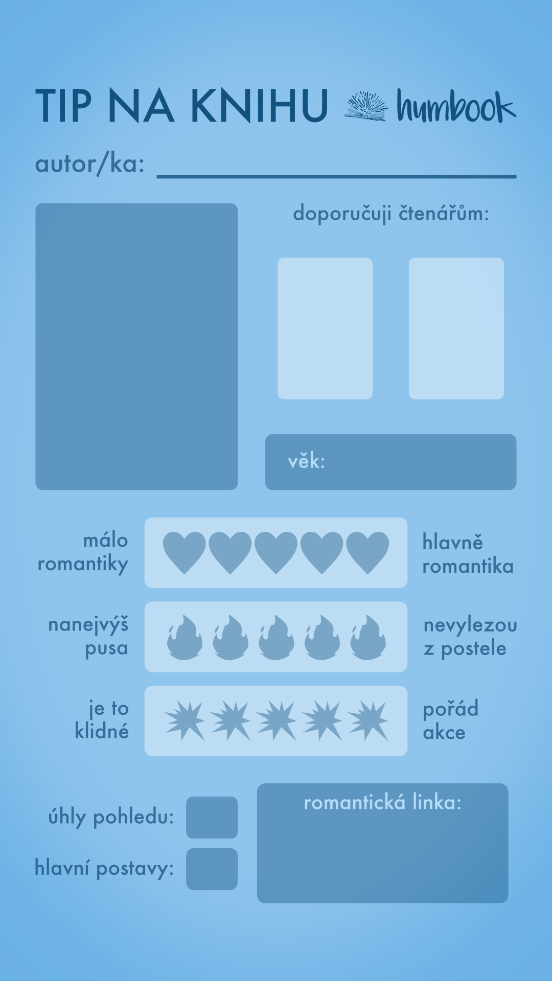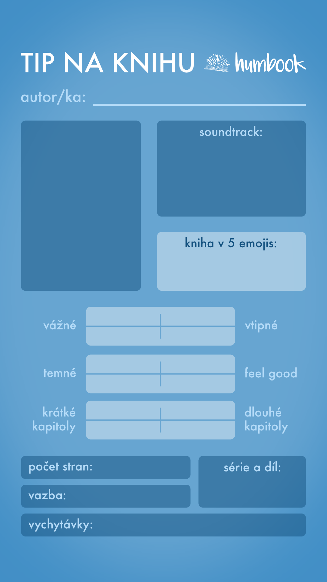 Série tří šablon, které můžete vypostovat zvlášť, nebo je dát všechny za sebou. Jedna verze je pro autory, ta další pro čtenáře. Stáhněte, nahrajte do stories, vyplňte, publikujte a nezapomeňte označit @humbook