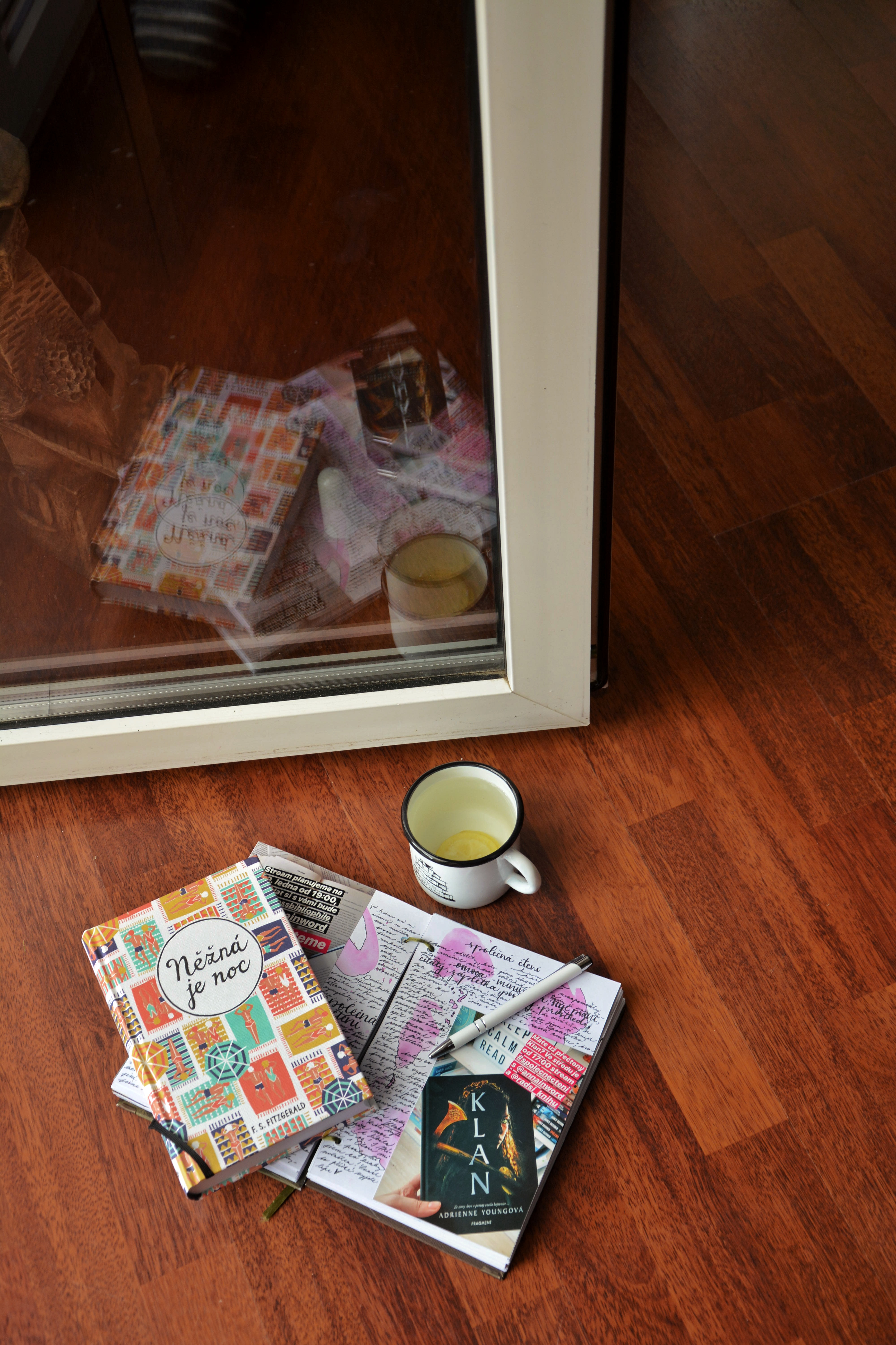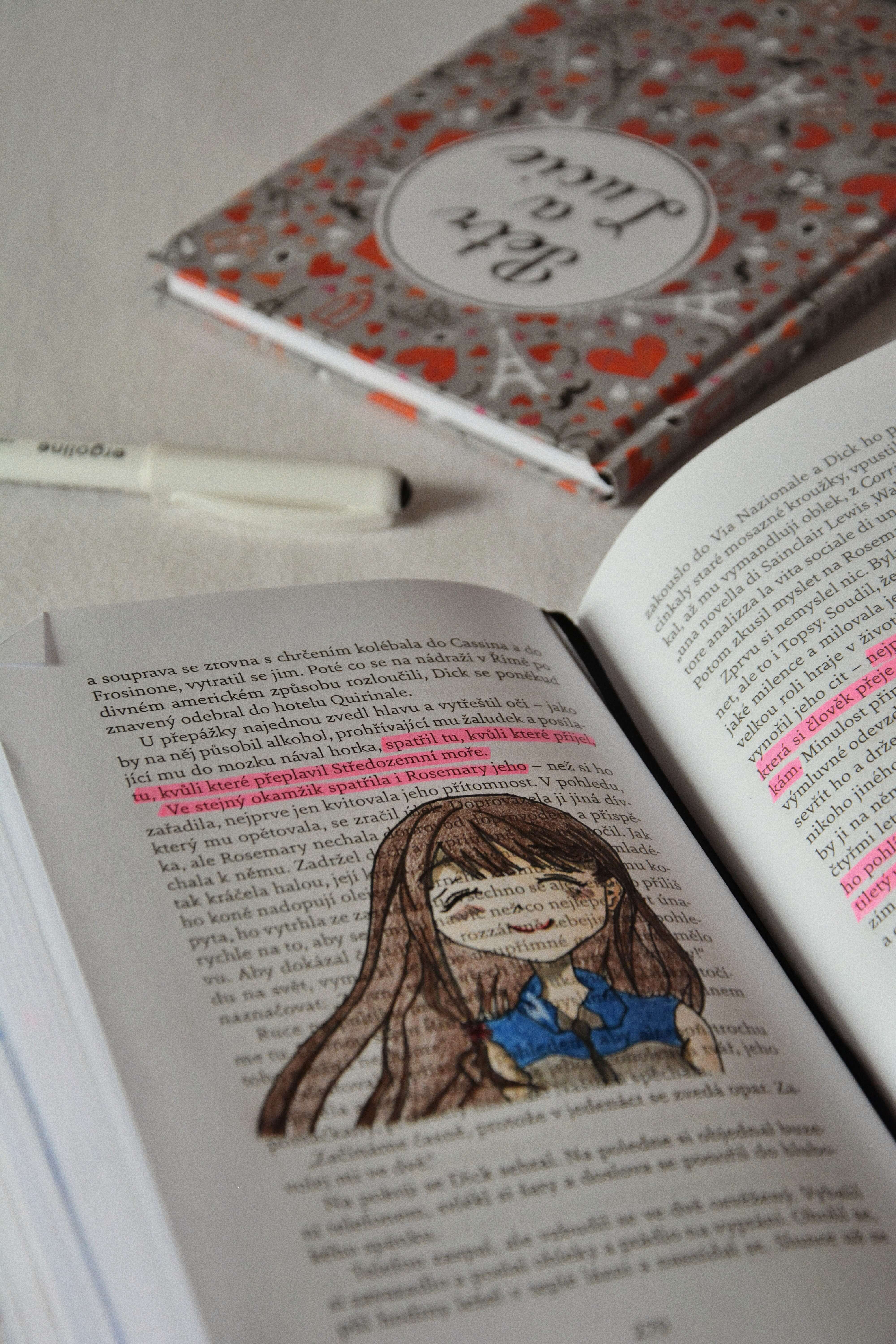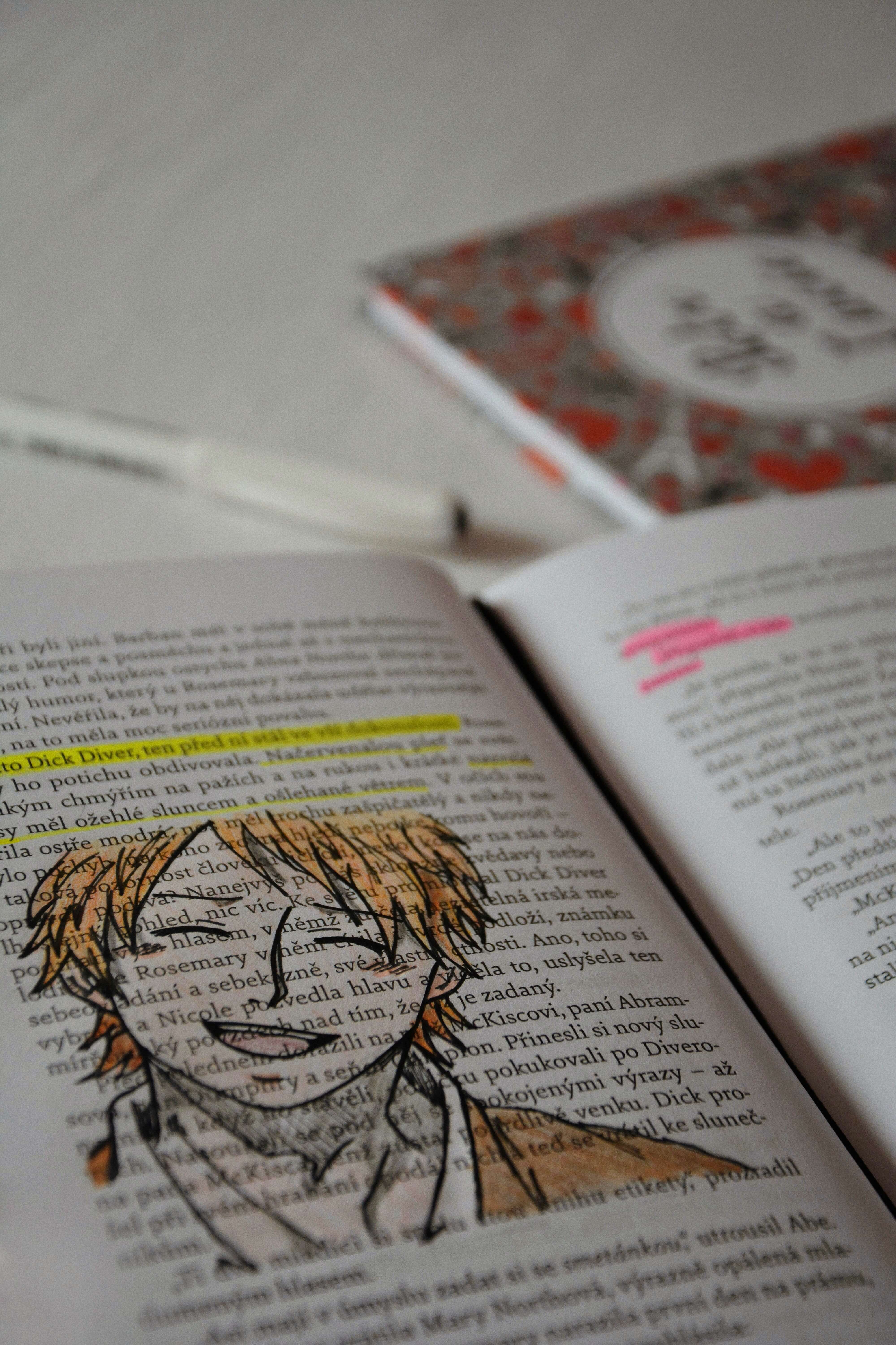 Teď ale tedy k tomu, jak jsem v knize postupovala a jak jsem jí „vylepšovala“. Přestože Knižní štafeta mě vcelku bavila, lepíkování a různé psaní poznámek jsem už znovu dělat nechtěla. U všech knížek jsem se ale nějakým záhadným způsobem sama od sebe (netuším, kde se to ve mně vzalo :D) naučila lámat růžky stránek, které mě nějak zaujmou (většinou citátem). A v tom jsem tedy pokračovala i u Něžná je noc – to byla jediná věc, kterou jsem během čtení dělala, protože jsem se chtěla plně soustředit na děj. Až po samotném dočtení jsem se v ději vracela na mnou vyznačená místa (tady mi právě skvěle posloužily zlámané růžky) a různě tyhle stránky upravovala a hrála si s nimi. Nejčastěji jsem do knížky kreslila hlavní postavy, psala zdobným písmem zajímavé věty a myšlenky a zvýrazňovačem si značila ten zbytek pasáží, které mě něčím zaujaly, naštvaly, dojaly, atd. Zvýrazňovala jsem neonovou žlutou a růžovou – žlutá pro ty pasáže, které ovlivnily děj knihy, růžově ten zbytek.