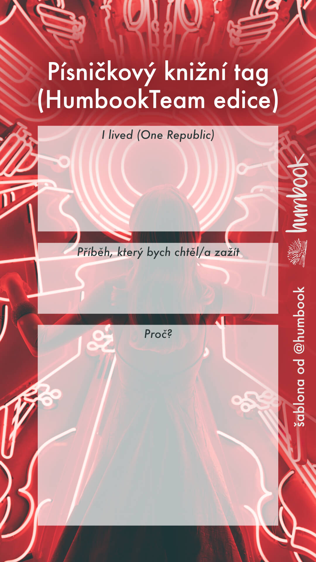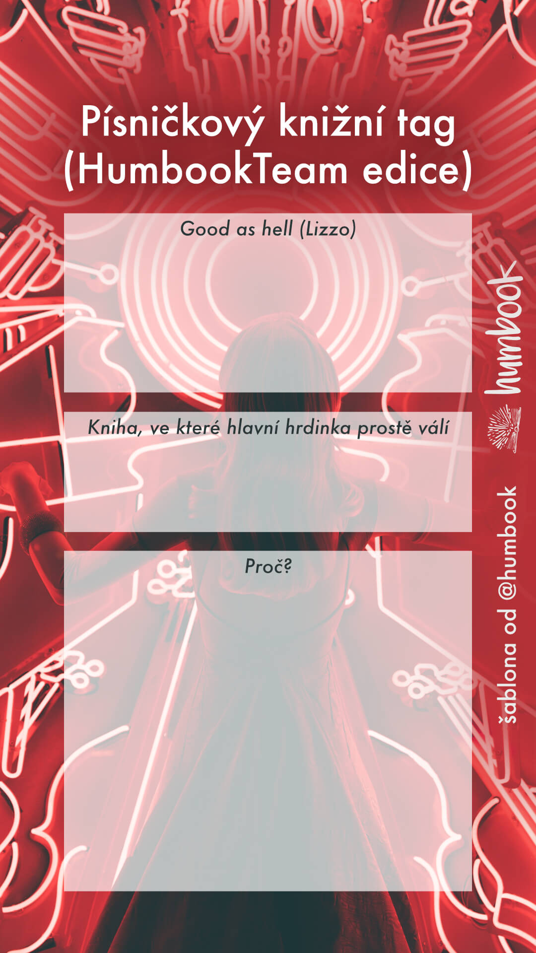 V HumbookTeamu hodně rádi posloucháme písničky (kdo taky ne, že?), takže jsme daly hlavy dohromady, inspirovaly jsme se našimi oblíbenými kousky a společně jsme stvořily zbrusu nový KNIŽNÍ TAG. A protože u tagu se sluší někoho nominovat, tak my nominujeme všechny z vás, kteří si ho chtějí taky zkusit. Jak? Prostě si vezměte naše písničky a výzvy k nim přiřazené a místo knih, co jsme vybraly my, dejte knihy a komentáře podle sebe. Můžete napsat článek na blog, natočit video na YouTube, na IGTV, můžete sepsat odpovědi do příspěvku na Instagramu nebo třeba jen vyplnit naši šablonu na stories… Ať už to bude kdekoliv, tak nás určitě nezapomeňte označit, ať se na vaše zpracování můžeme podívat a inspirovat se ve vašich odpovědích.
