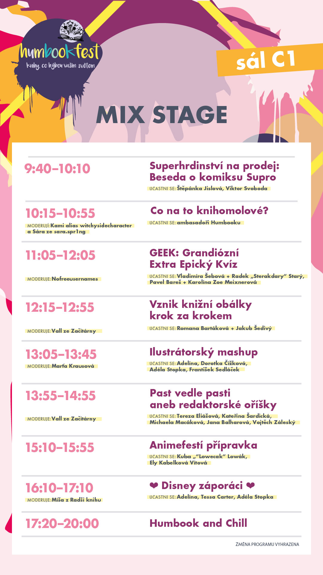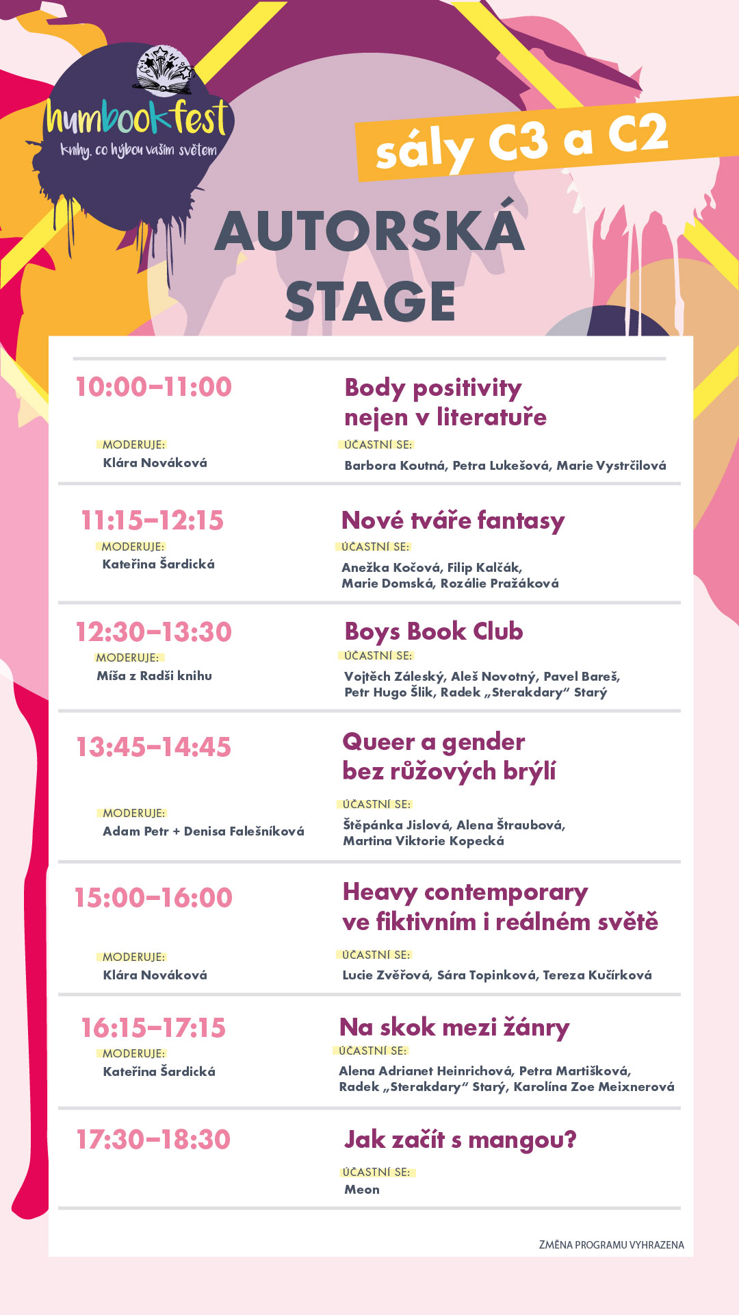 • 16:35–17:35: Lucie Zvěřová, Sára Topinková, Štěpánka Jislová, Viktor Svoboda, Petr Hugo Šlik