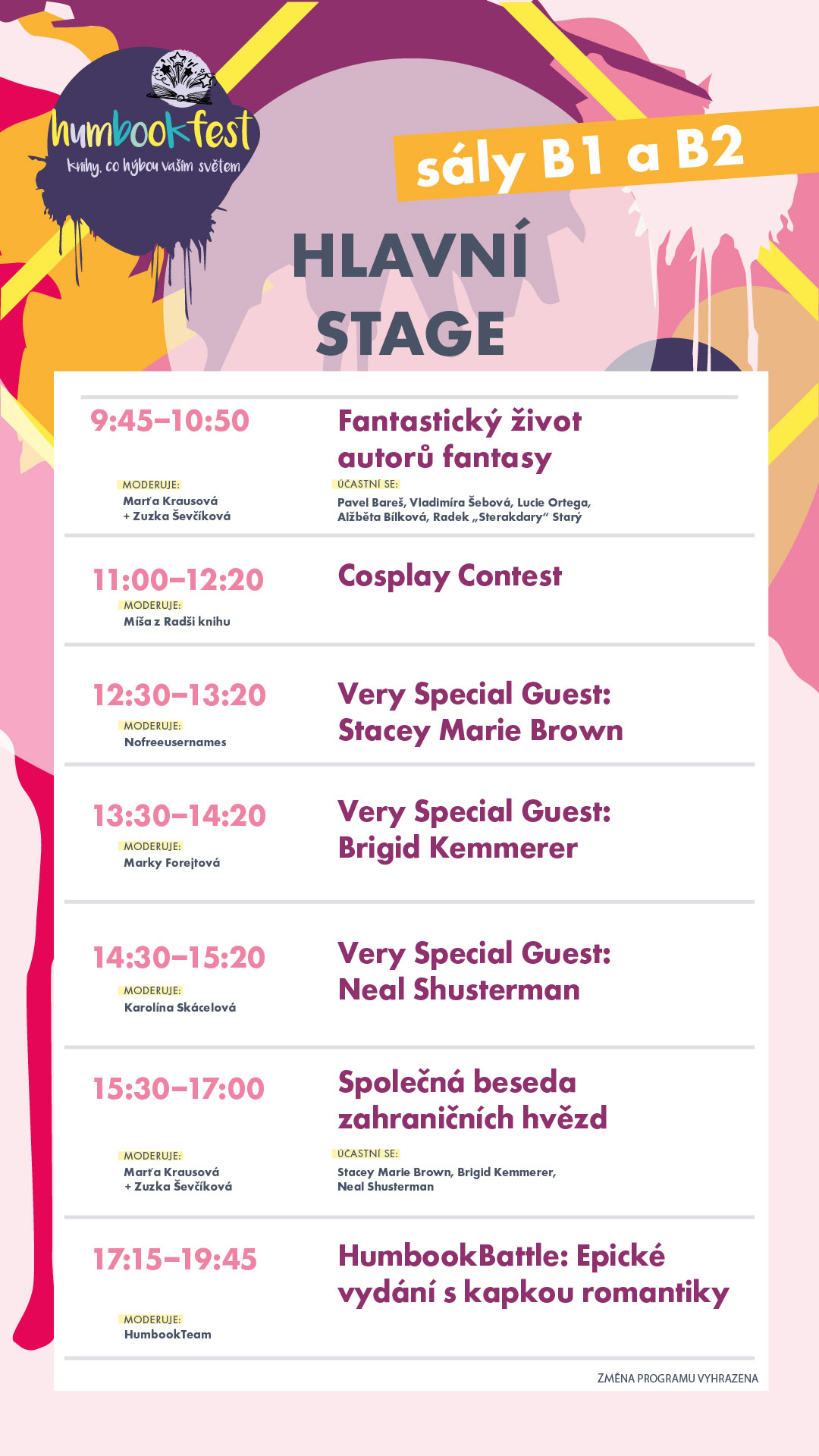 • 13:55–15:10: Vladimíra Šebová, Lucie Ortega, Alžběta Bílková, Radek „Sterakdary“ Starý