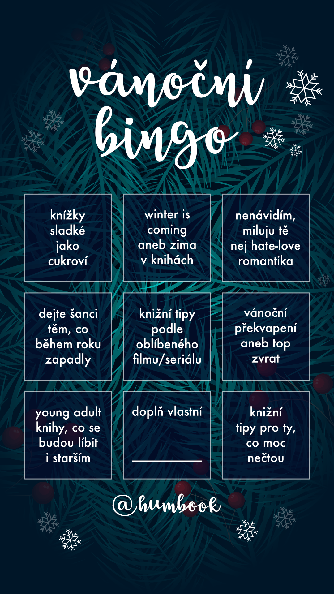 - Úspěšné splnění = 9 fotek ve feedu, nebo 9 stories uložených ve výběru na profilu, každý post s hashtagem #humbookbingo (musí být veřejně) kdykoliv během adventu (čili od 29. listopadu do 24. prosince). Bingo můžete splnit během několik dní, nebo klidně během celé soutěžní doby, je na vás, jak si to rozvrhnete.